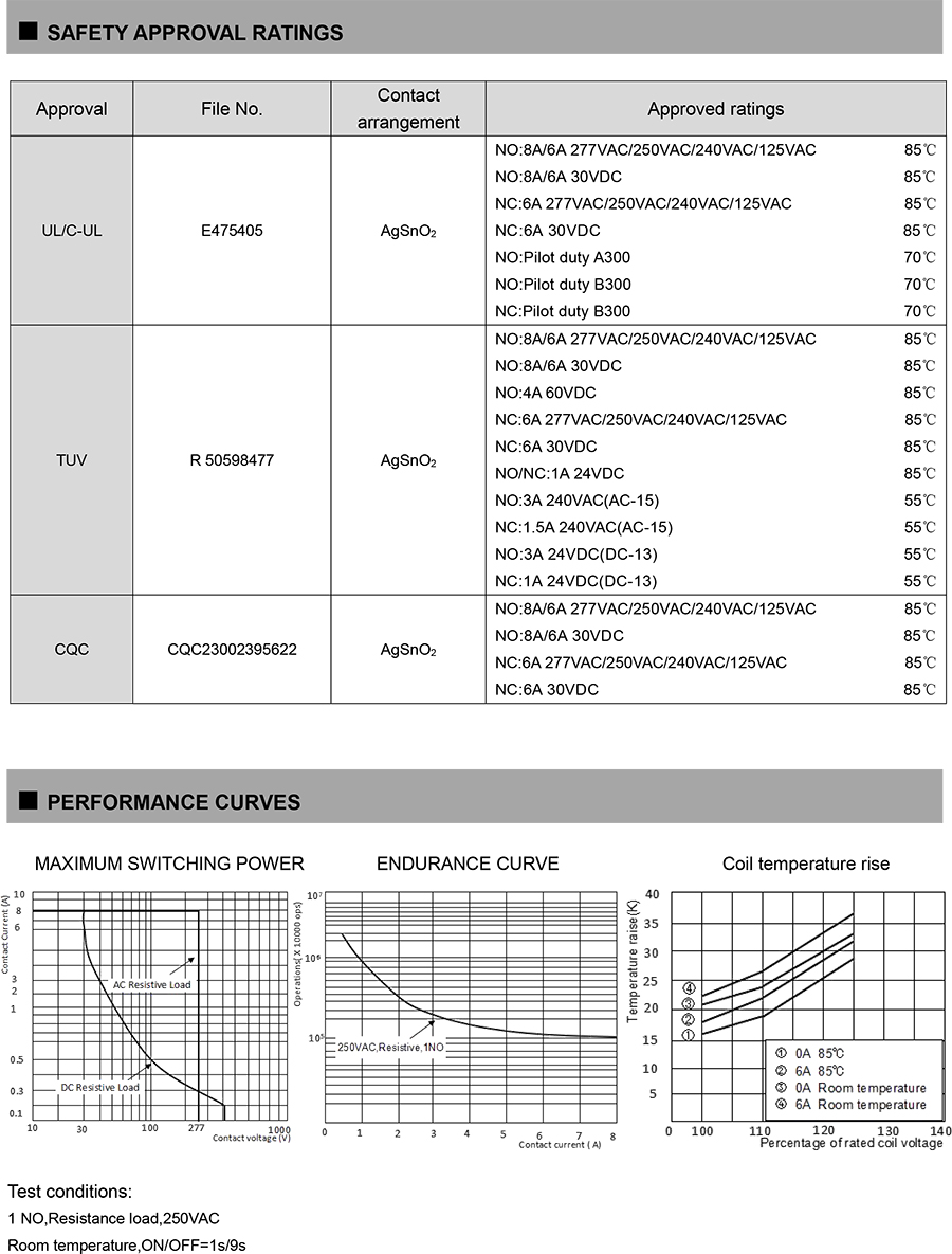 ● Strong insulation ability:Surge voltage (Between coil&contacts) :10KV Surge voltage(Between contact groups) (Waveform 1.2/50μs):6kV