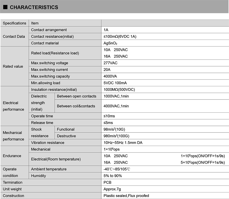 ● Breakdown voltage (between coil and contacts): 4KV
