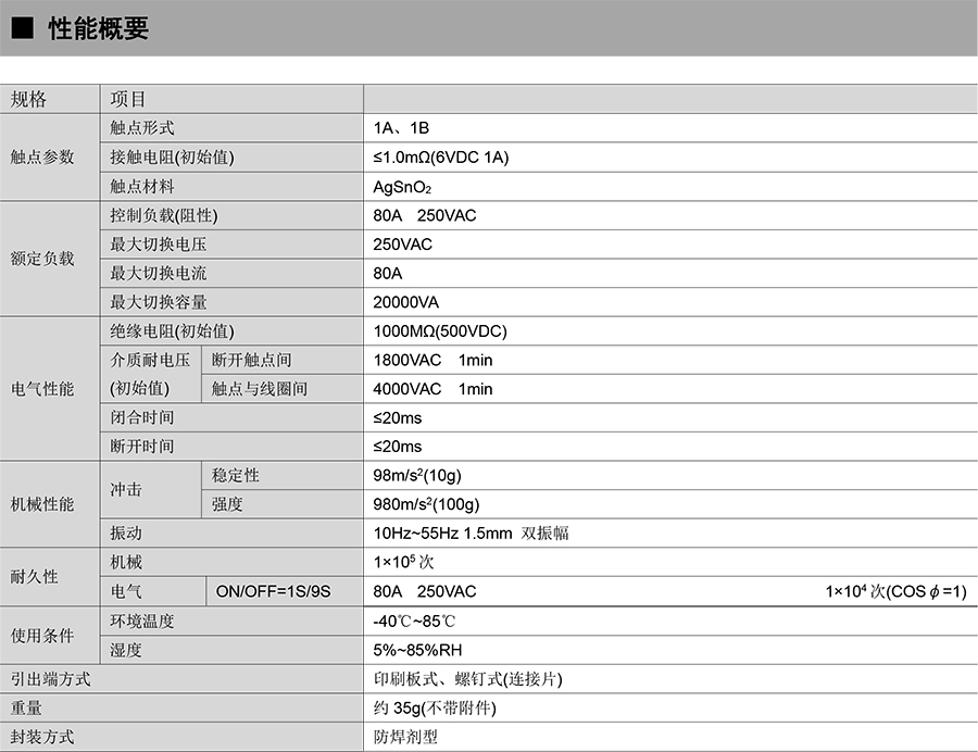 ● 80A 觸點切換能力